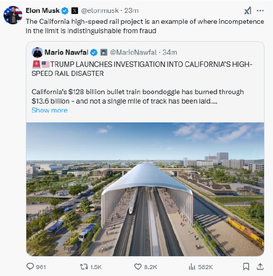 马斯克转发了一位媒体人的帖子,该帖子称:“特朗普对加州高铁灾难展开调查。加州预算1280亿美元的高铁项目已经烧了136亿美元,而一英里的轨道都没有铺设好。特朗普称其为‘美国历史上管理最糟糕的项目’,并发誓要调查大规模的成本超支和管理不善。“