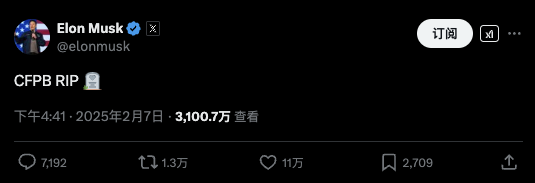 “消费者金融保护局安息吧。” 马斯克周五在 X(原推特)上写道。