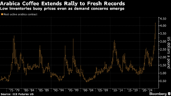 由于对供应短缺的担忧挥之不去,阿拉比卡咖啡期货创下历史新高,继续深入超买区域。