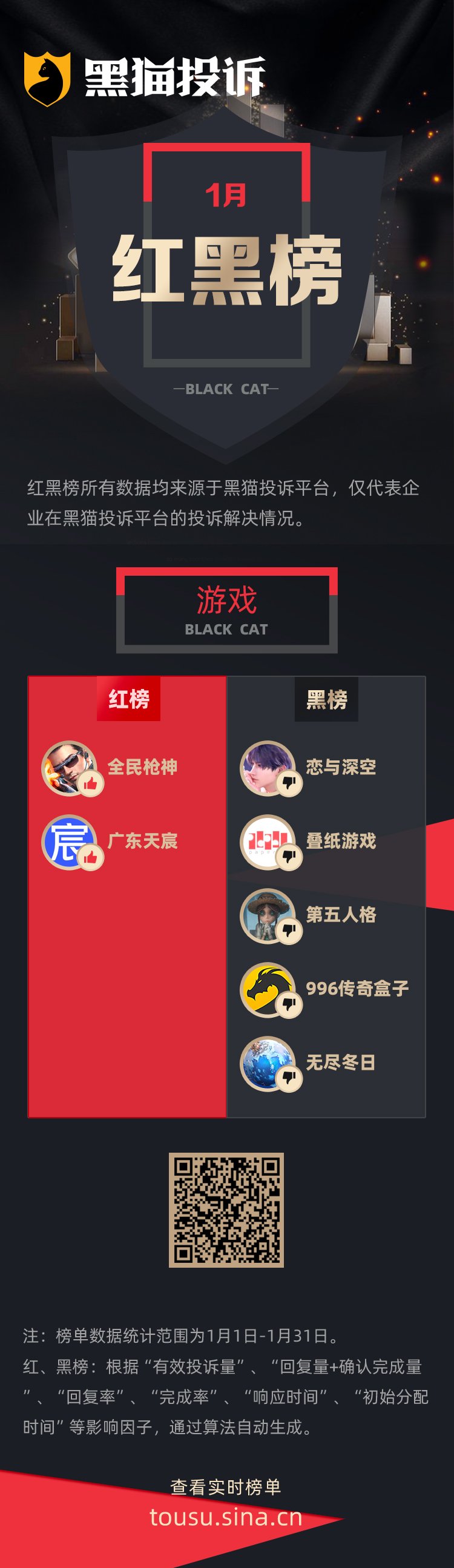 1月黑猫投诉网游领域红黑榜:恋与深空被指抽卡概率异常
