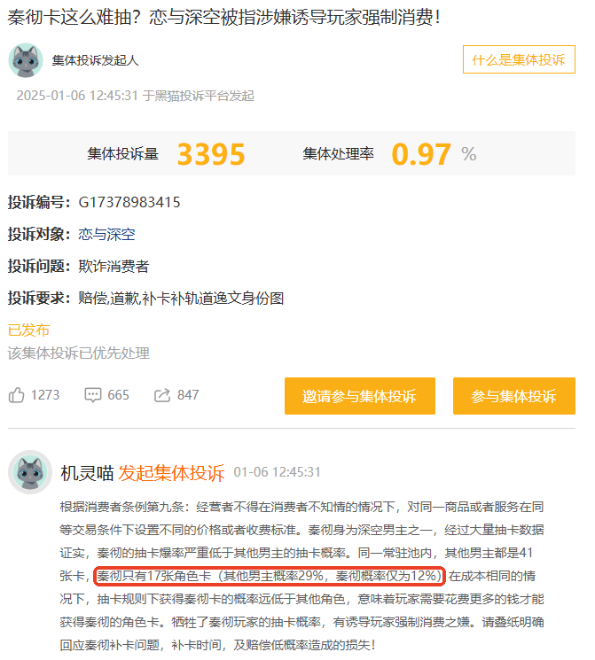 在本月中,黑猫投诉平台收到玩家们的集中反馈称,作为游戏《恋与深空》男主角之一的秦彻被指抽卡概率异常,经玩家们的自发统计,同一卡池周期内其他男主角的获取概率为29%,而秦彻仅为12%,过低的概率导致抽取秦彻所花的费用远高于其他角色。截至本月底该集体投诉累计达3395件,处理率不足1%。