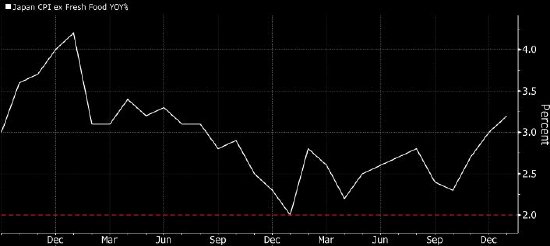日本政府周五公布的数据显示,1月份剔除生鲜食品的消费者价格同比上涨3.2%,是2023年6月以来的最大涨幅。增幅略高于经济学家预估的3.1%。