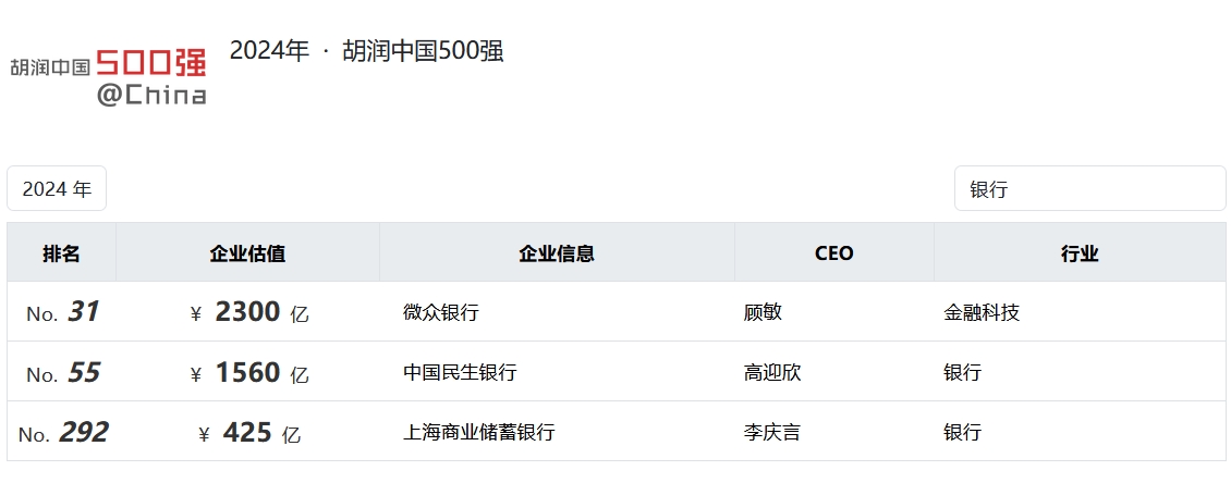 2024胡润中国500强榜单发布:3家银行机构上榜,微众银行位列第31名