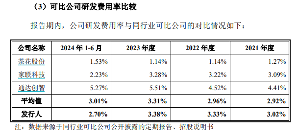 值得关注的是,相比远超过与同行的毛利率与销售费用率,太力科技的研发费用率却并不高,报告期内分别为3.02%、3.33%、3.38%、2.70%,与同行业可比公司的平均值基本保持一致,甚至最新一期略低于同行。
