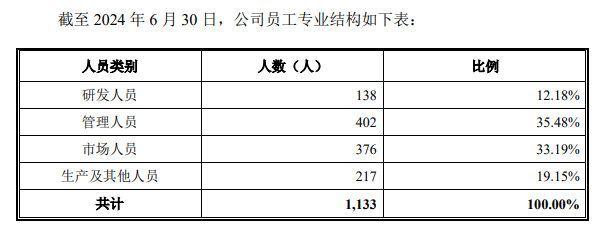 由此来看,太力科技对于研发的投入力度远不如营销,而这一点也员工结构可以看出。截至2024年6月30日,太力科技的员工共计1133人,其中管理人员402人占比35.48%,在员工结构中占比最高,而生产及其他人员、研发人员却分别仅有217人、138人,占比分别为19.15%、12.18%。但太力科技作为一家专注于新材料研发和真空技术产业化应用的公司,为何研发和生产人员的合计占比还不足公司总员工的一半?管理人员的占比畸高又意味着什么?更何况,从员工学历结构来看,太力科技的超一千名员工中,拥有硕士学历的员工仅有16人,占比仅为1.41%,而大部分员工学历则为大专、大专以下。