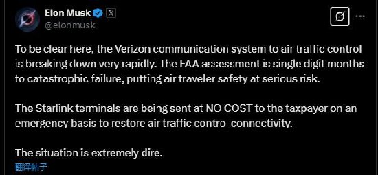 马斯克称空中交通管制通信系统正在崩溃,急需星链接管