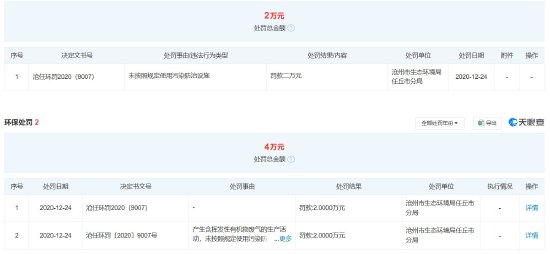 2020年,公司曾因未按照规定使用污染防治设施,被沧州市生态环境局任丘市分局处以行政处罚和环保处罚,罚款金额分别为2万元和4万元。
