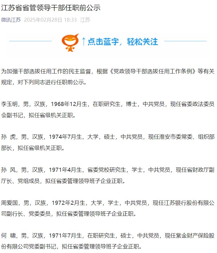 2月28日金融一线消息,据中共江苏省委组织部发布的江苏省省管领导干部任职前公示,现任紫金保险党委副书记何啸,拟任省委管理领导班子企业正职。