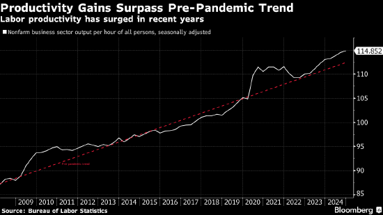劳动生产率受到密切关注,美国劳工统计局的数据显示,这个衡量经济效率的指标近年来的增长超过了疫情前的趋势。