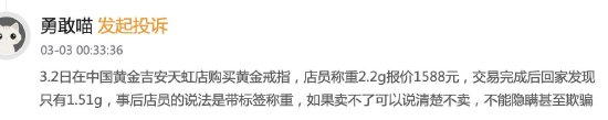花1588元买中国黄金戒指店里称2.2g回家扫码仅1.51g,店员:2.2g为带标签称重