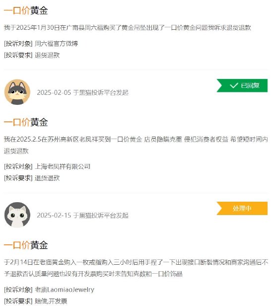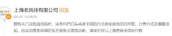 《5D调查》搜索黑猫投诉发现,以“一口价”黄金为关键词的投诉条数高达上万条,涉及中国黄金、周六福、周大生、六福珠宝、老凤祥、老庙黄金等品牌。在其中一个投诉中,上海老凤祥有限公司回复称,“顾客去门店挑选饰品时,店员均已口头或者书面的方式告知该饰品的材质、计费方式及佩戴须知。因此消费者再确定是否要购买该饰品前,请核对好以上信息再去结账付款。”