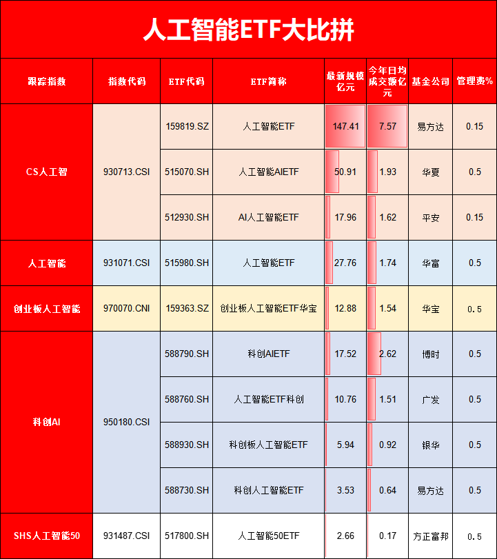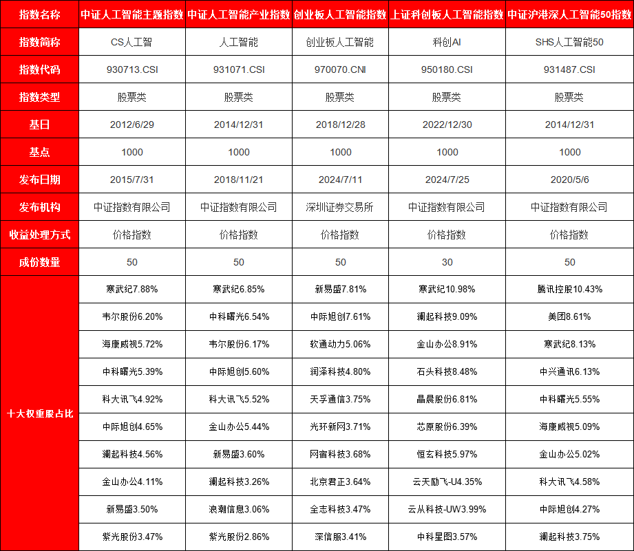 跟踪指数方面,目前市场上的人工智能ETF主要跟踪CS人工智(代码:930713.CSI)、科创AI(代码:950180.CSI)以及SHS人工智能50(代码:931487.CSI)等指数。这些指数反映了不同的人工智能投资策略和市场表现。