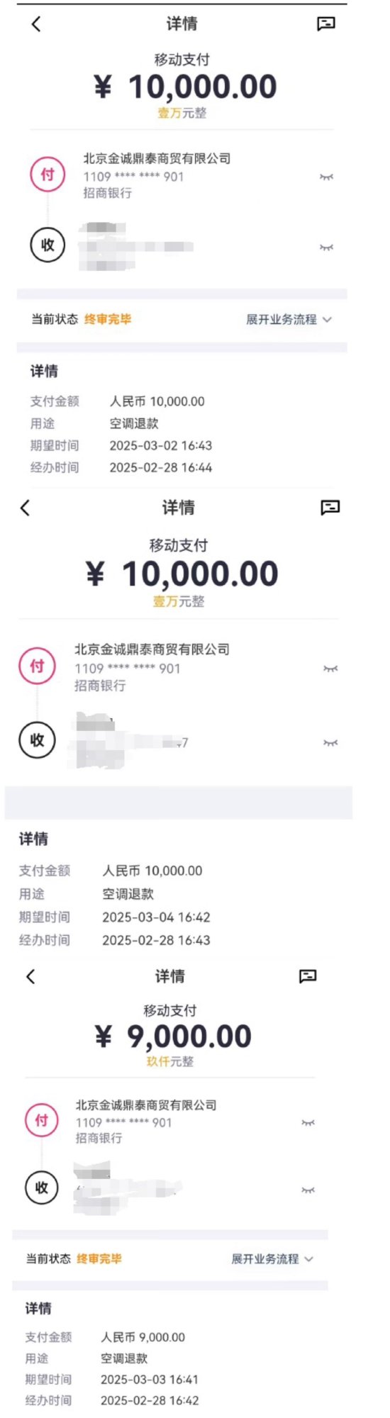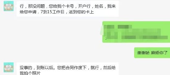 2月28日,史先生回复称,“退款已出账,因为今天封账,是延时到账,分三笔。”直到3月6日,小李仍旧没收到退款,再次追问下,史先生称“卡号输错了,要重新操作一下。”3月9日,史先生表示退款还需要两天到账,“这回肯定ok了。”但是小李至今也没收到退款。