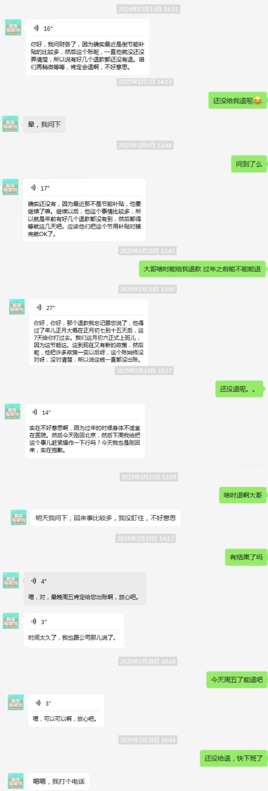北京的小李投诉称,自己于2024年11月10日在北沙滩红星美凯龙地下一层格力空调购买中央空调,金额为29000元。11月15日,因情况有变想退货,与格力销售人员史先生协商一致后对方同意退款,小李提供了银行账号,史先生承诺,将在7-15个工作日退款到账户。“截止目前3月12日仍未退款,已经拖延近四个月。期间格力销售人员多次拖延退款时间,提供了转账记录但又说银行卡号输错了。”