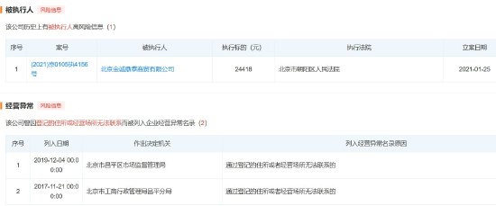 5D调查还发现,北京金诚鼎泰商贸有限公司在2021年01月25日曾被北京市朝阳区人民法院列为被执行人,执行标的为24418元。此外,该公司还曾因登记的住所或经营场所无法联系而被列入企业经营异常名录。