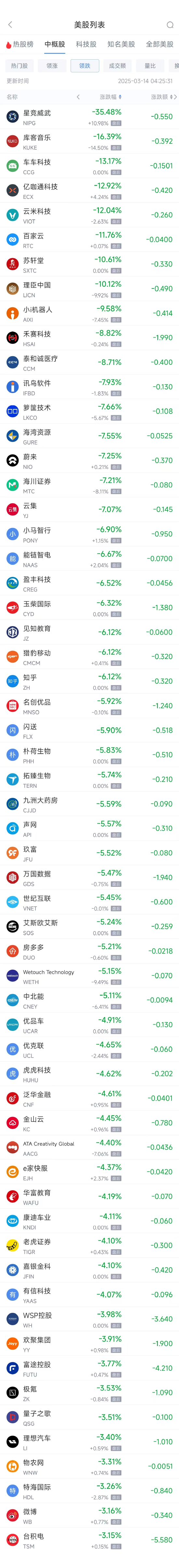 领跌中概股列表: