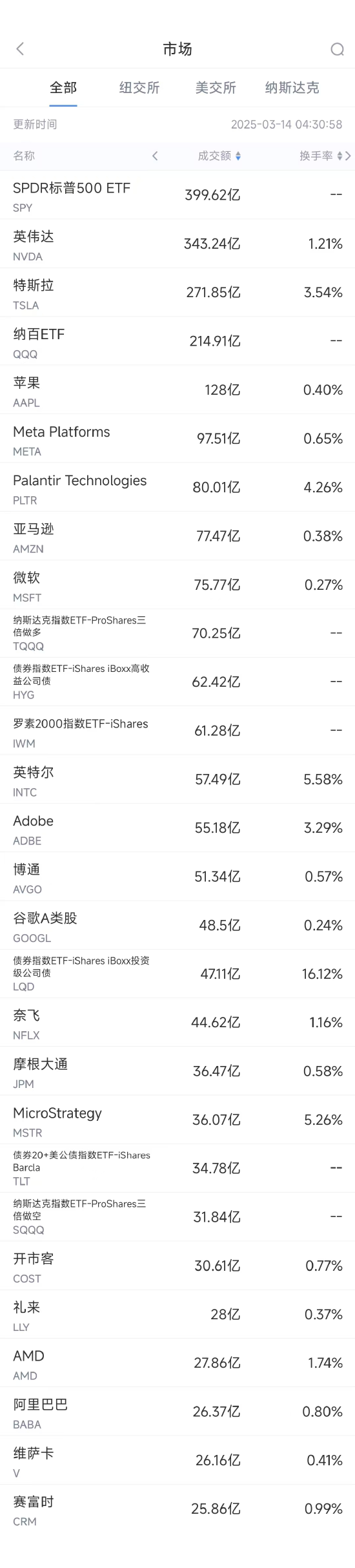 3月14日美股成交额前20:特斯拉连跌八周,被丹麦养老基金拉黑