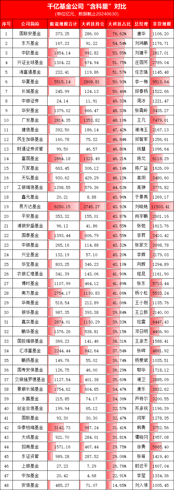 Wind数据显示,截至2024年6月30日,非货规模超过千亿的基金公司共有48家。在这48家基金公司中,各公司在大科技领域的布局差异显著,“含科量”高低不同。