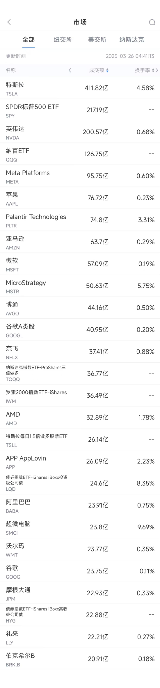 3月25日美股成交额前20:阿里巴巴主席警告AI数据中心泡沫化