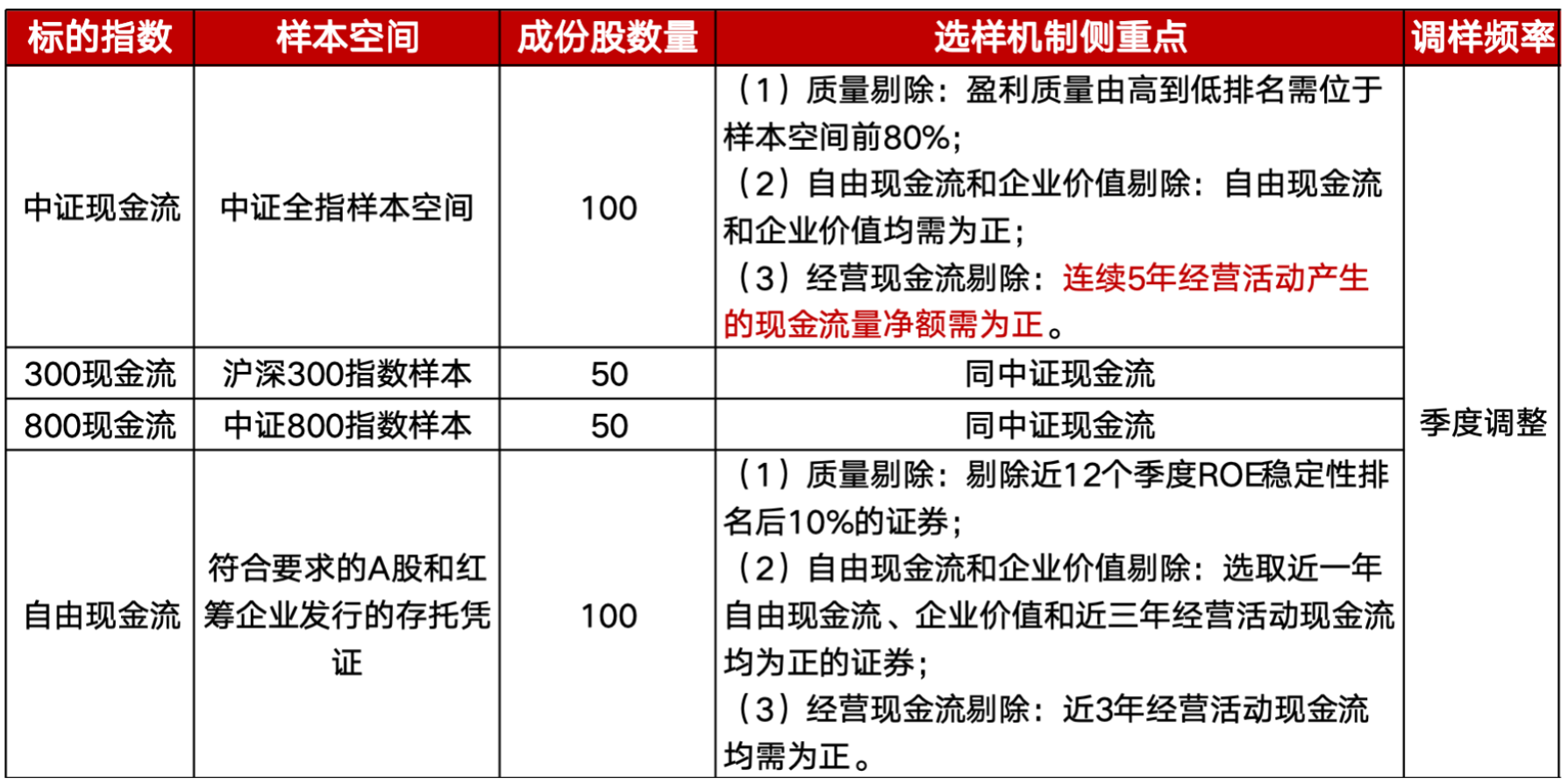 选样方法:先剔除最近半年日均成交金额排名后20%的证券,以及国证行业分类标准下金融或房地产行业的证券,还有近12个季度ROE稳定性排名后10%的证券;再选取近一年自由现金流、企业价值和近三年经营活动现金流均为正的证券,并剔除近一年经营活动现金流占营业利润比例排名后30%的证券;最后,对剩余证券按近一年自由现金流率从高到低排序,选取前100只证券构成指数样本,其中自由现金流率=自由现金流/企业价值。