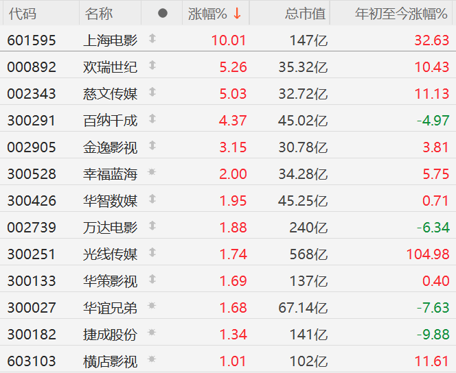 A股影视股走高:上海电影涨停,慈文传媒、欢瑞世纪涨5%,百纳千成涨4%,华谊兄弟、万达电影、华策影视跟涨